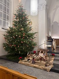 Unter dem grossen, wunderschön mit Strohsternen geschmückten Christbaum – gestaltet vom Sakristanenteam rund um Massimiliano, Jésus und Erwin, sowie Äpfeln von Marie-Therese und Margrit. Herzlichen Dank auch an Uschi und Monique für die Gestaltung der Krippe! – gingen die Menschen bewegt in die Nacht hinaus.
