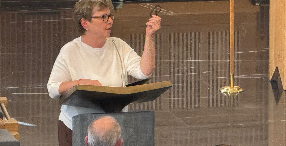 Schliesslich trat Elisabeth Korner ans Mikrofon und bat alle vom Team und den Behörden nach vorne, auch Felix Känzig (Sozialdiakon der evang. ref. Kirche), Pfr. Josip Knežević aus Rüschlikon, Claudia Haltenberger als Vertreterin Kirchenpflege und viele mehr, die zum erweiterten Pfarrteam gehören. Sie streckte einen grossen Karabinerhaken in die Höhe und erläuterte die Bedeutung: im steilen Gelände müsse immer einer voran gehen und die Haken setzen, der nächste sichert das Seil und die Gruppe hat bereits Orientierung. Gleichzeitig habe der Karabiner von Mike Qerkini zwei Öffnungen, so dass der Pfarrer ein besonderes Seil auch nach „noch weiter oben“ einfädeln kann!