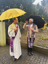 Um 11.30 Uhr versammelten sich trotz anhaltenden Regens zahlreiche Angehörige auf dem Tannsteinfriedhof zur Gräbersegnung. Während der Regen stärker wurde, erklangen Worte des Trostes und der Fürbitte. Das Weihwasser in den beiden Kesseln mischte sich mit dem Regenwasser – ein eindrückliches Zeichen für Gottes Segen, der alles durchdringt.